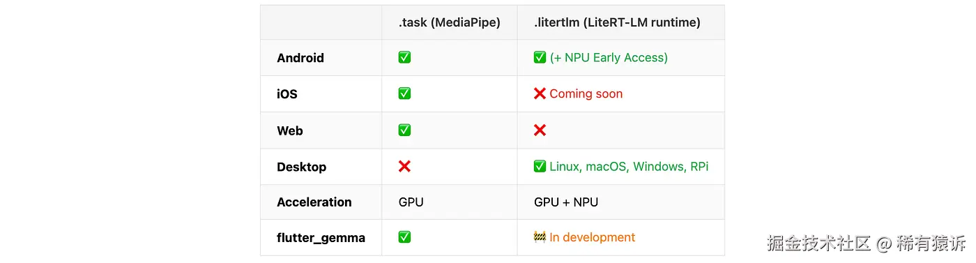 litertlm --- 这是 Google 推出的一种新格式,是 .task 的升级版,具有更好的压缩效果和额外的元数据。MediaPipe 也可以在 iOS、Android 和 Web 上运行 .litertlm,但不具备 NPU 等额外功能。 .litertlm 的主要优势在于其独立的运行时 LiteRT-LM:它支持 NPU(神经处理单元),可实现更强大的加速,并支持桌面平台------Linux、macOS、Windows,甚至 Raspberry Pi。但 LiteRT-LM 运行时目前仍处于早期预览阶段:iOS 和 Web 平台暂不支持(即将推出)。
