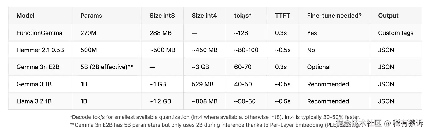 还有一个重要的指标------准确率。伯克利函数调用排行榜 (BFCL) 是评估函数调用能力的标准基准。 Gemma 3 1B 的得分约为 31%,Llama 3.2 1B 约为 26%,两者未经微调的性能都很弱。由于 Gemma 3n 是通用型程序,因此未对其进行测试。Hammer 2.1 0.5B 没有公开数据,但其 1.5B 版本开箱即用的得分约为 73%------尽管它在 int8 内存中占用约 1.5GB 的空间,是 FunctionGemma(288MB)的 5 倍。