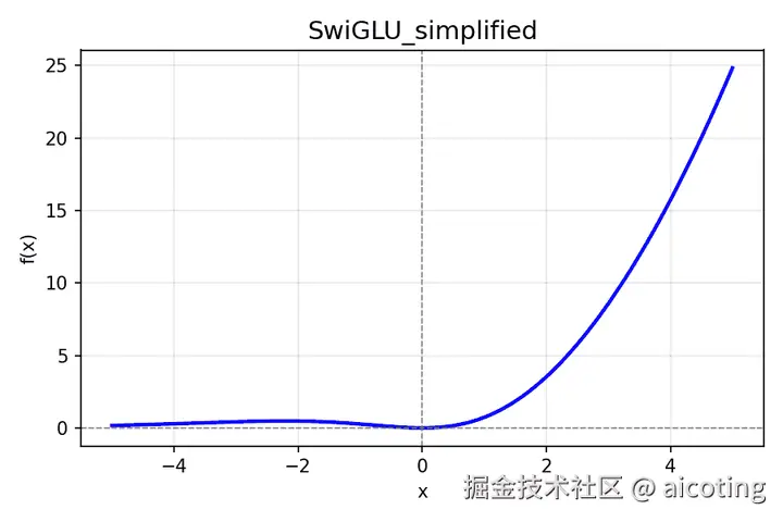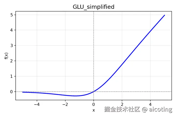 GLU/SwiGLU 在实际中是门控形式(two linear branches),是向量上的逐元素操作;为了在一维上可视化,我用简化的标量形式来画图 ------ 把两条分支都用相同的输入值(即把 a=x, b=x),因此 GLU(x)=x∗sigmoid(x) SwiGLU(x)=x∗SiLU(x) 。这能直观展示门控机制的形状差异。
