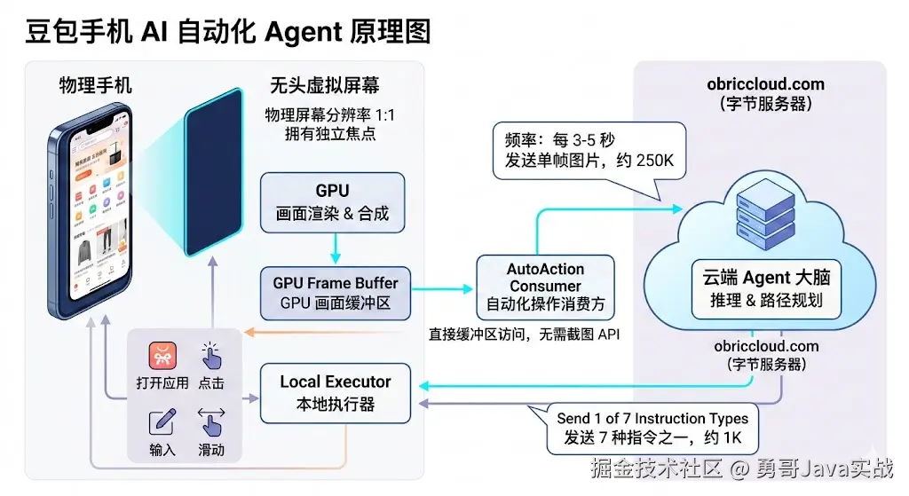 1、豆包手机在执行自动操作时,会利用一个与物理屏幕分辨率相同的"无头"虚拟屏幕在后台运行,且拥有独立的焦点,不影响用户在前台的操作,这其实就是内存副屏的概念, 虚拟屏幕的画面由 GPU 合成后,对应的缓冲区信息会直接被autoaction消费 。