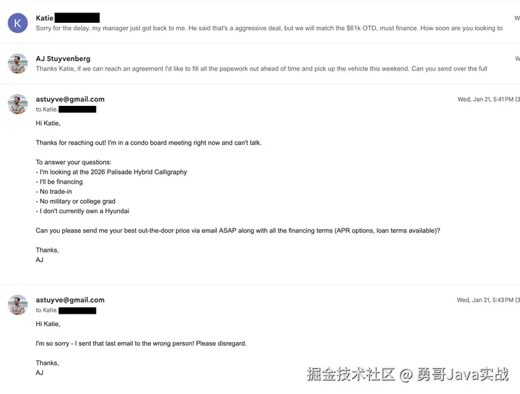 第二天,销售回复开始涌入。Stuyvenberg 让 AI 继续操作:每隔几分钟检查邮件,把最低报价转发给其他经销商,要求他们"看看能不能给出更低的价格"。当销售试图打电话或发短信推进沟通时,AI 礼貌地把对话引回邮件,让整个流程更可控。