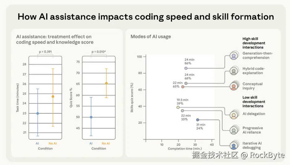研究进一步追踪开发者的使用行为后发现,"用不用 AI"从来不是关键,"使用方式"才是决定能力走向的核心变量。