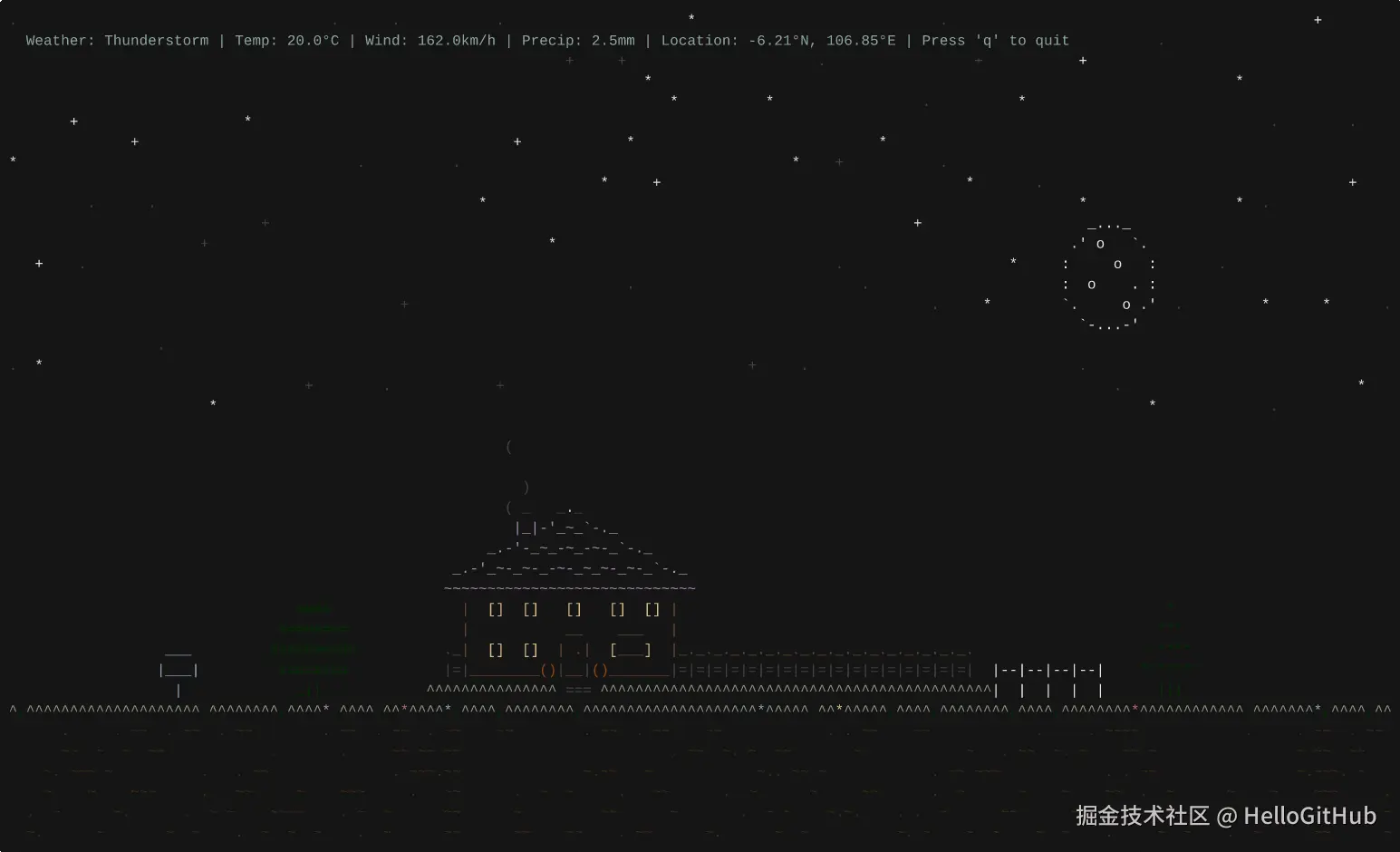 27、weathr:Rust 写的实时 ASCII 天气动画。这是一款用 Rust 编写的终端查看天气工具,可通过 ASCII 动画实时展示当前天气情况,支持下雨、下雪、闪电和昼夜变化等动画效果。