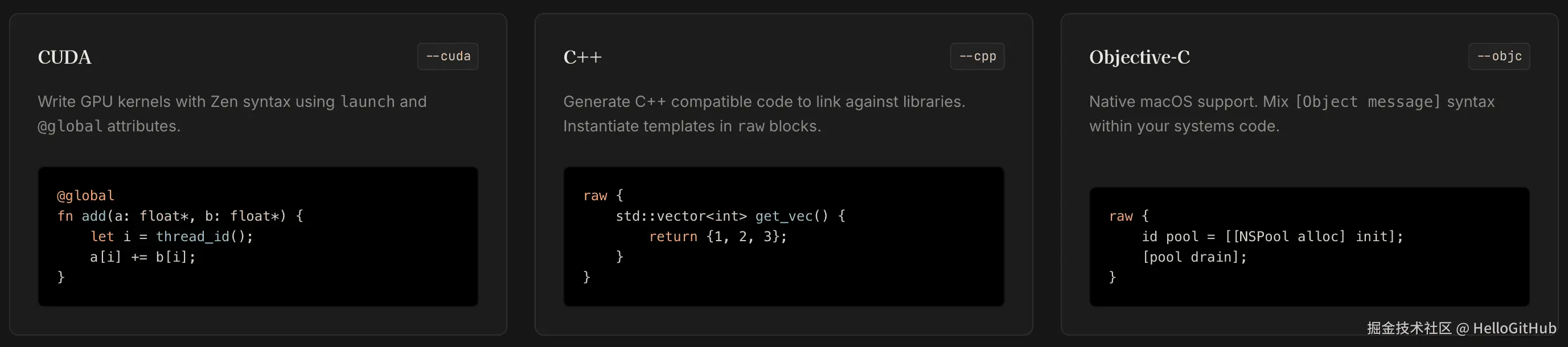2、Zen-C:像高级语言一样写 C 代码。这是一个现代系统编程语言,写起来像高级语言又能像 C 语言一样运行。它通过编译生成 GNU C/C11 代码,兼容 C ABI(应用程序二进制接口),支持无缝集成到现有的 C 语言生态,在保持 C 语言运行效率的基础上,提升开发体验。