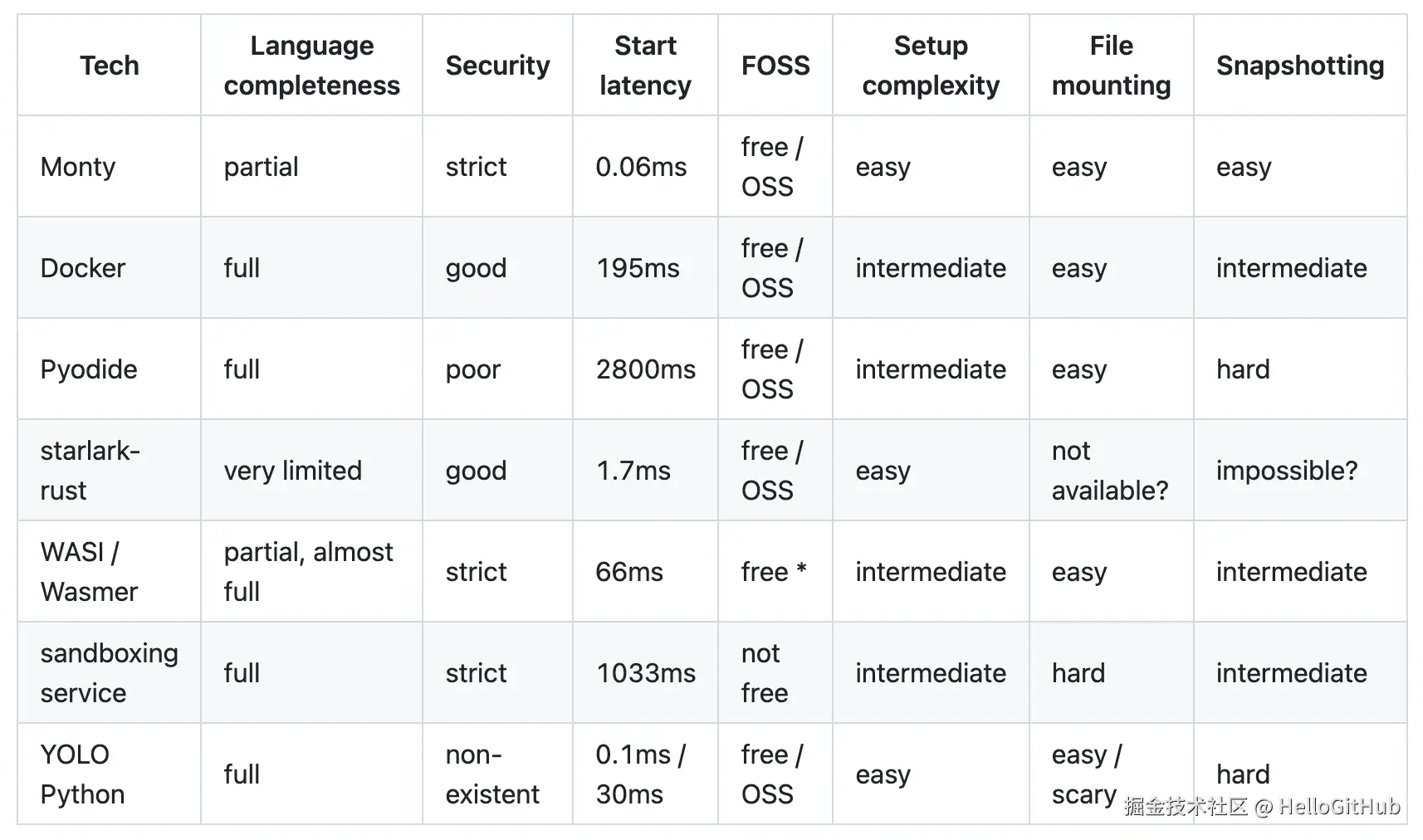 26、monty:启动速度极快的 Python 解释器。该项目是 Pydantic 团队用 Rust 开发的 Python 解释器,具有启动快、安全隔离、状态快照等特点,适合在 AI Agent 中运行大模型生成的 Python 代码。