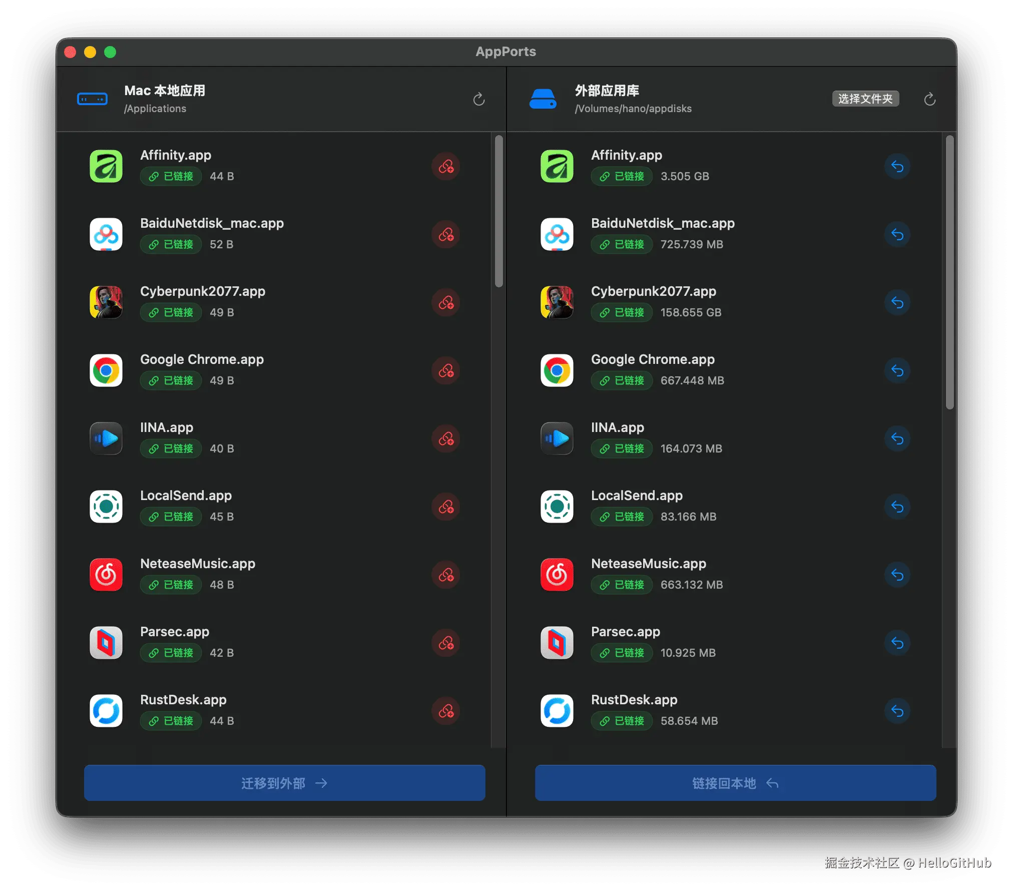 28、AppPorts:一键将 macOS 应用迁移到外部硬盘。该项目通过 Contents 链接的方式,将 macOS 应用迁移到外部存储设备(移动硬盘、SD 卡或 NAS),并在原位置保留应用入口,让用户能够像之前一样启动应用,在不影响使用的前提下释放宝贵的 macOS 存储空间。来自 @Zehua Wang 的分享