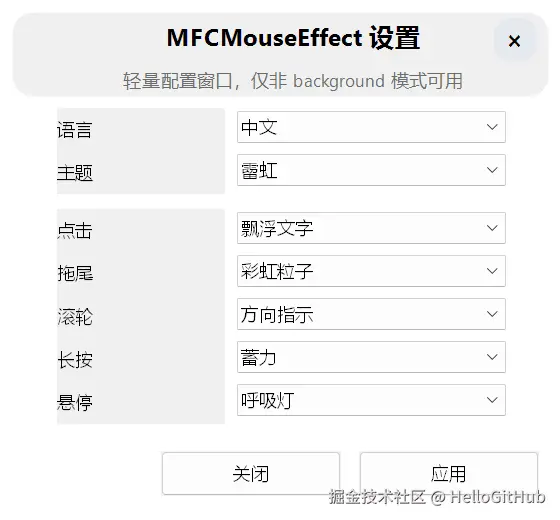 5、MFCMouseEffect:Windows 鼠标特效增强工具。这是一款轻量级的 Windows 桌面鼠标/光标特效工具,支持点击波纹、粒子拖尾、悬停发光、漂浮文字等多种鼠标特效。来自 @sqmw 的分享