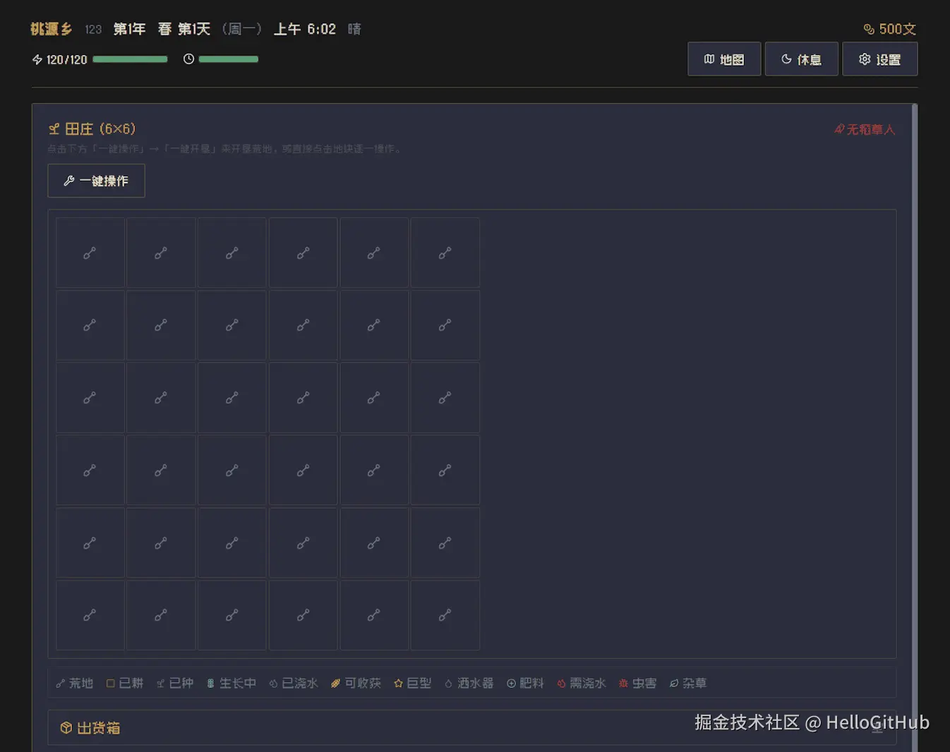 17、taoyuan:文字版田园模拟经营游戏。这是一款名为《桃源乡》的纯前端文字版田园模拟经营游戏,灵感来自《星露谷物语》。它采用像素与中国风相结合的视觉设计,玩家可以按照自己的想法经营农场,体验种植、钓鱼、烹饪、畜牧养殖和矿洞探险等多种玩法。来自 @谦君 的分享