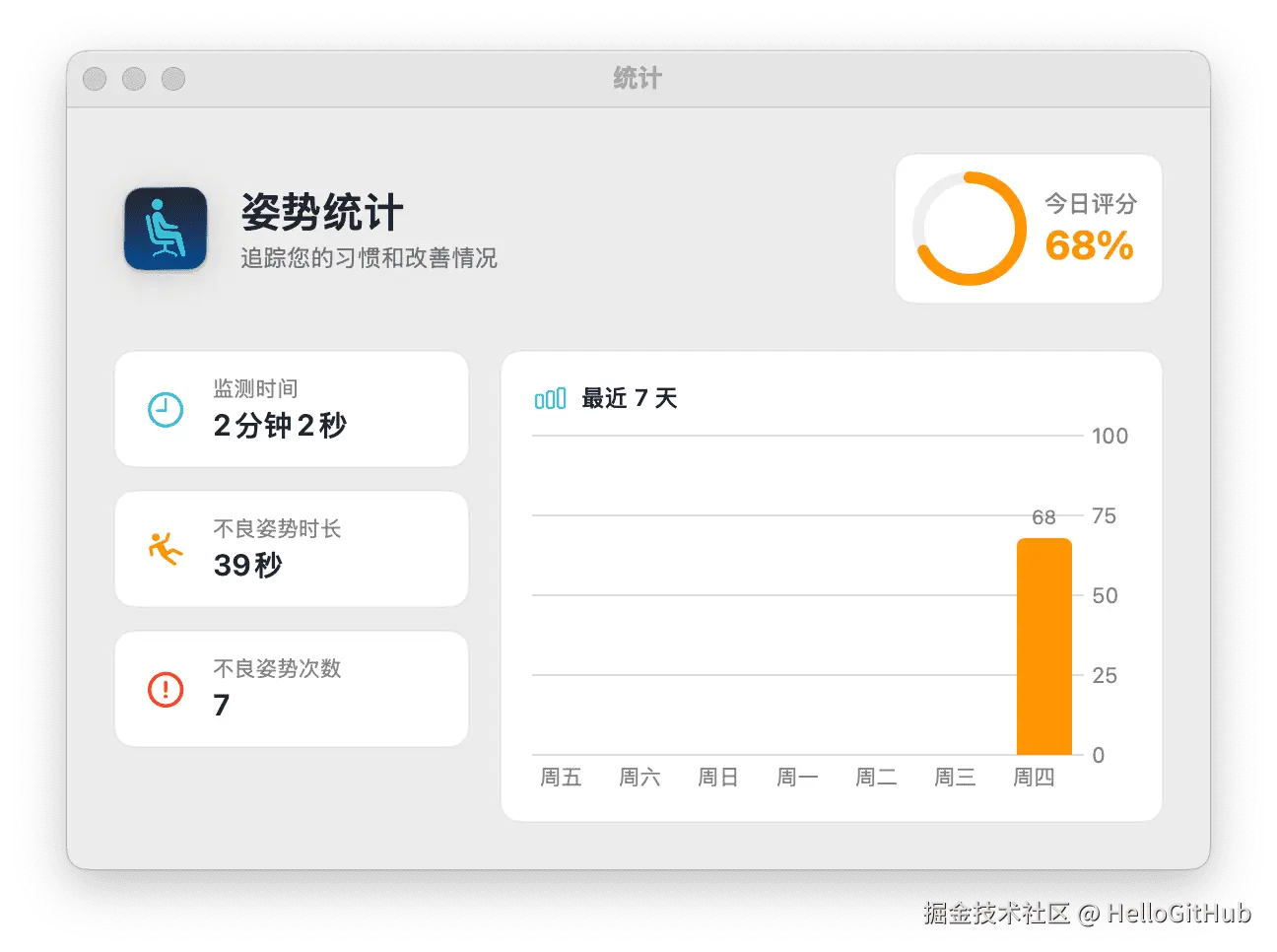 30、dorso:矫正坐姿的 macOS 应用。这是一款用 Swift 开发的 macOS 坐姿监测应用,可通过摄像头或 AirPods 实时检测坐姿。当发现用户驼背或前倾时,应用会逐渐模糊屏幕,从而提醒用户及时纠正坐姿。