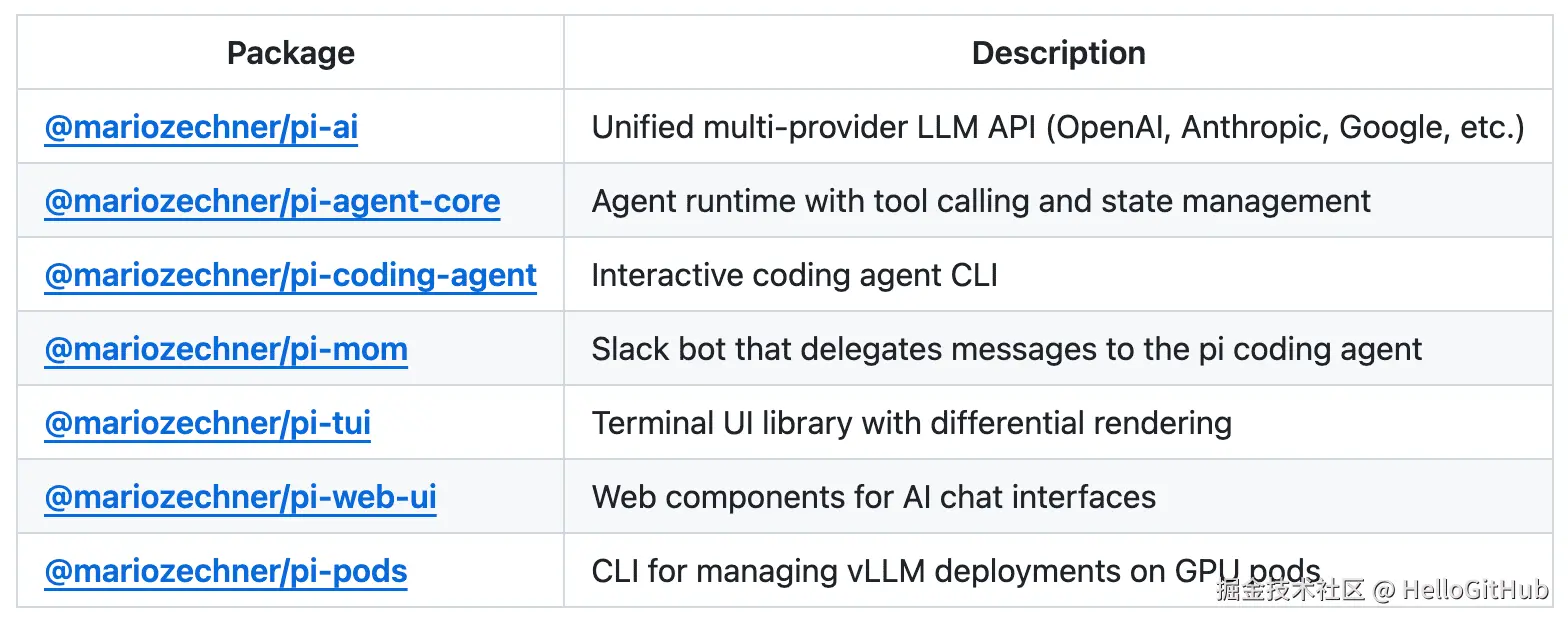 35、pi-mono:极简的 AI Agent 工具箱。这是一款基于 TypeScript 开发的 AI Agent 工具箱,爆火的 OpenClaw 就是基于该项目开发出来的。它提供开发 AI Agent 所需的基础功能,包括统一多 LLM 服务接口、Agent 状态管理、工具调用、交互式命令行界面、WebUI 和 Slack 机器人集成等。