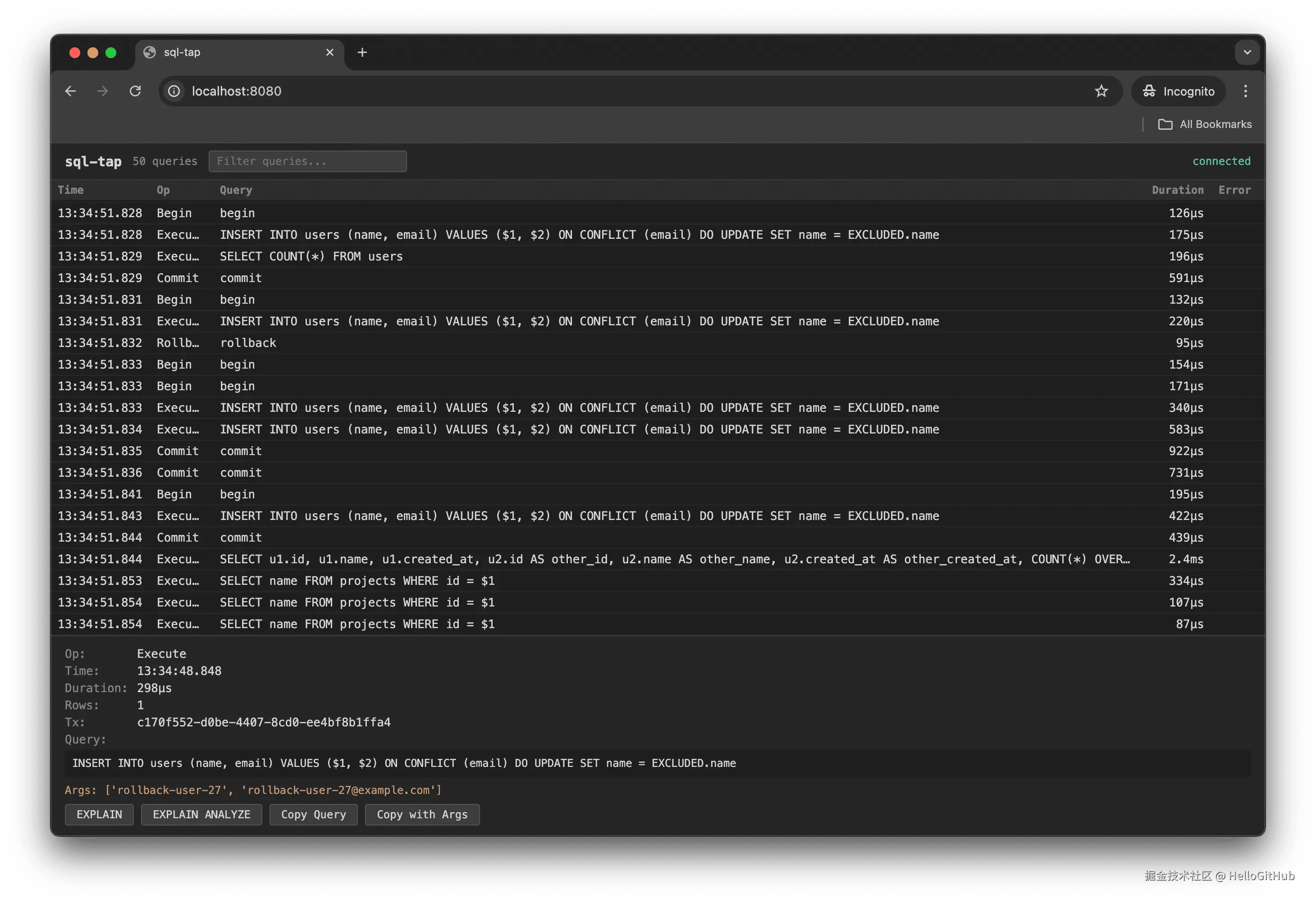 8、sql-tap:实时监控 SQL 流量的工具。这是一款基于 Go 开发的实时 SQL 流量监控工具,无需修改代码即可使用。它作为代理部署在应用与数据库之间,通过解析数据库 wire 协议捕获所有查询,提供 TUI 和 Web 两种使用方式,支持 PostgreSQL、MySQL 和 TiDB 数据库。