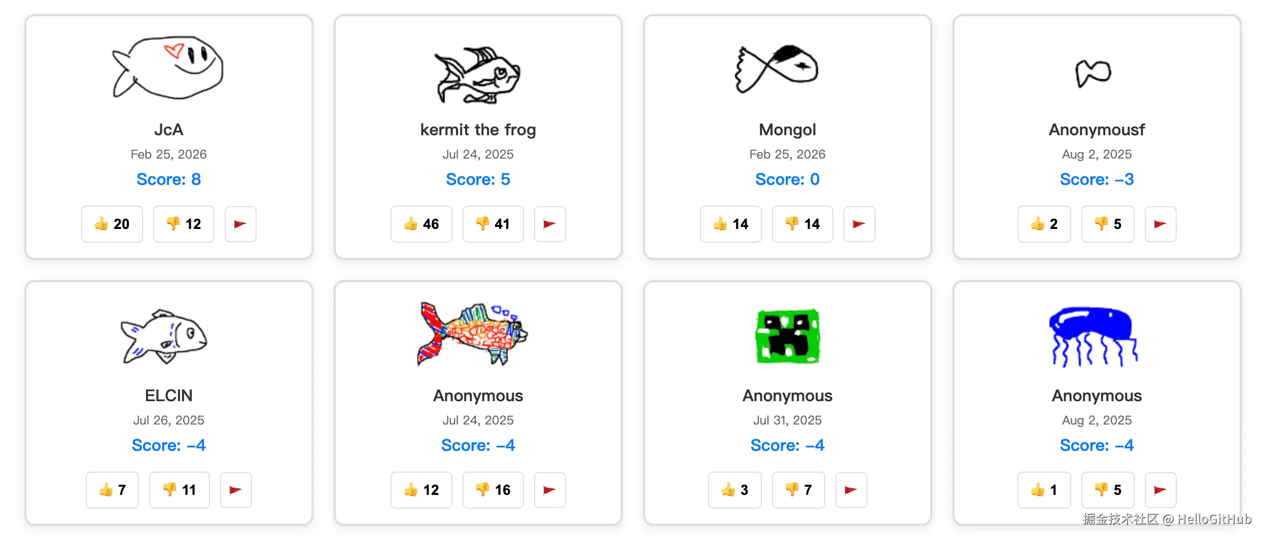 37、fishes:手绘鱼类的在线虚拟水族馆。该项目是让用户通过手绘创作鱼类涂鸦,并通过 AI 技术判定作品与鱼的相似度,通过审核的鱼会被放入一个全球共享的虚拟水族箱中。