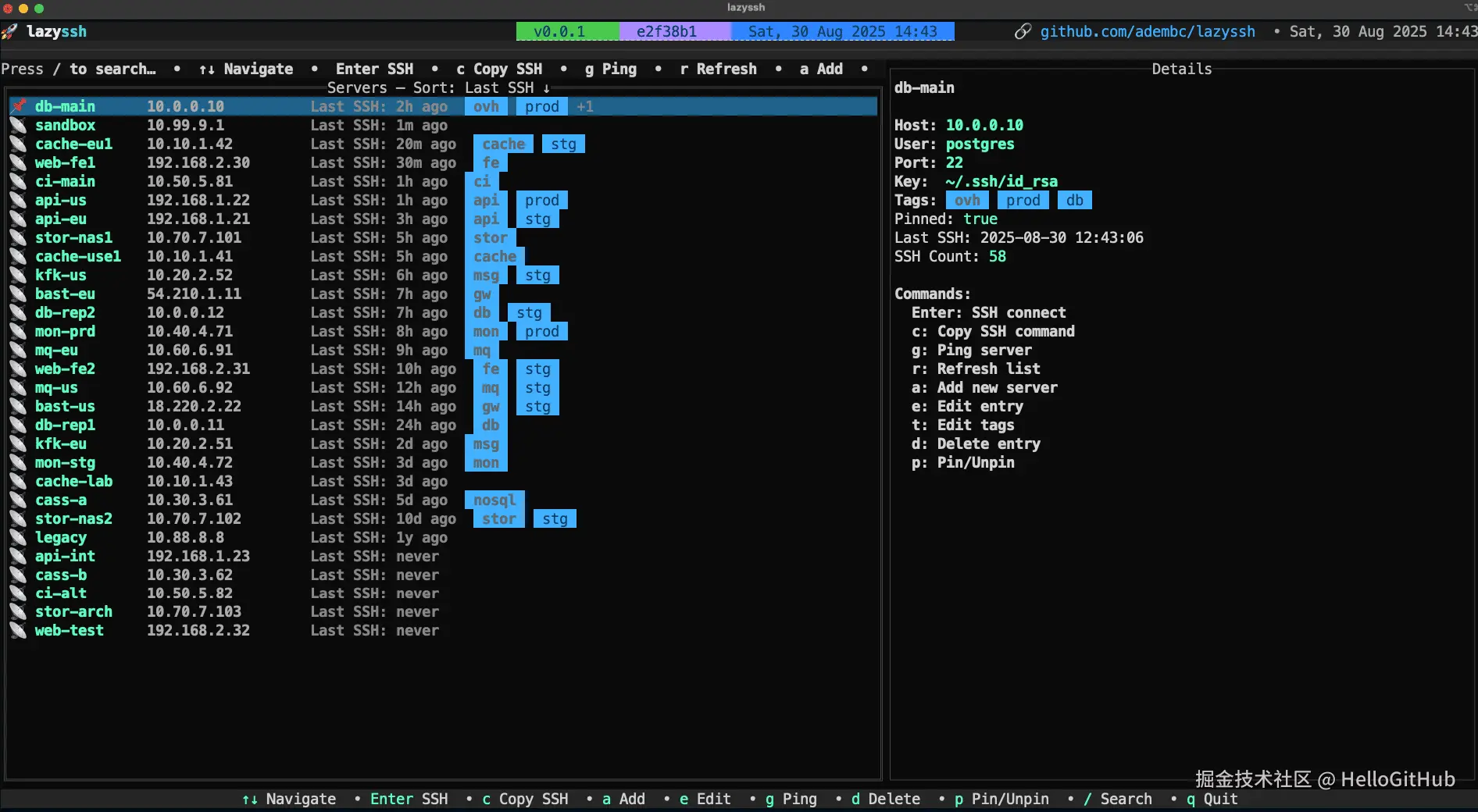 7、lazyssh:终端交互式 SSH 管理工具。这是一款 Go 写的终端交互式 SSH 管理工具,基于 OpenSSH 执行连接安全可靠。它提供直观易用的终端界面,支持模糊搜索、排序、Ping 检查和一键连接等功能。来自 @孤胆枪手 的分享