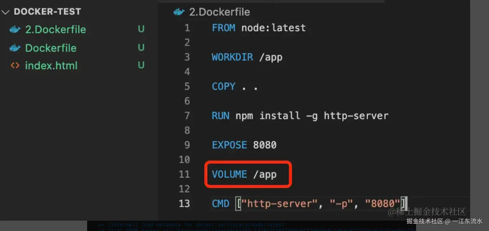 把这个文件保存为 Dockerfile,然后在同级添加一个 index.html。