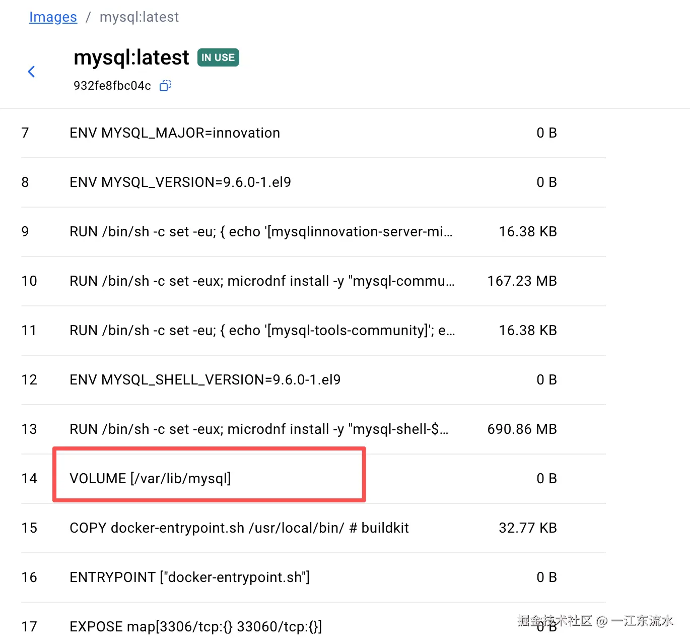在镜像详情可以看到 mysql 的 dockerfile,确实声明了 volume。