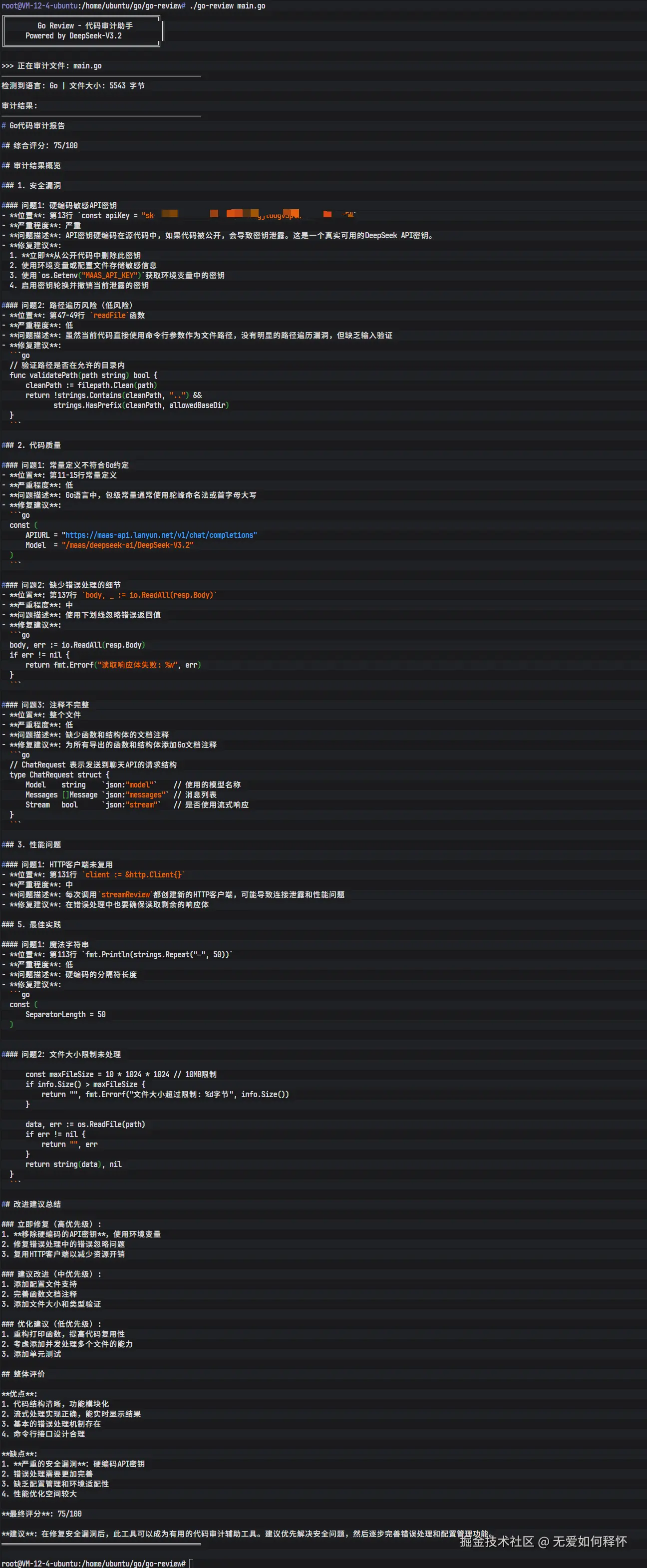 在当前软件工程领域,代码安全性与质量控制已成为DevSecOps流程中的核心环节。随着大语言模型(LLM)技术的飞速发展,利用生成式AI进行静态代码分析(SAST)已成为提升审计效率的重要手段。本文将详细阐述如何在 Ubuntu Linux 环境下,从底层环境构建开始,利用 Go 语言的高并发特性与 DeepSeek-V3 模型的推理能力,开发一款流式响应的自动化代码审计工具。