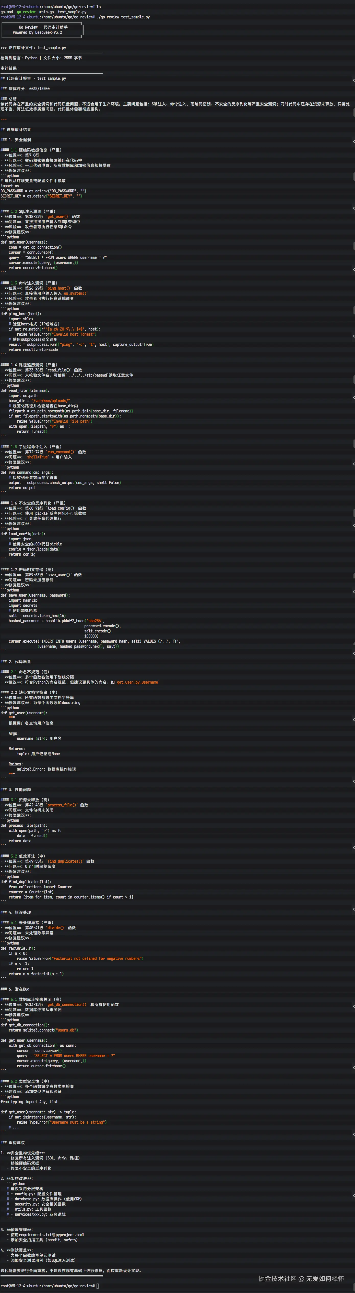 - 分析维度:安全漏洞(注入、XSS)、代码质量、性能问题、错误处理、最佳实践。