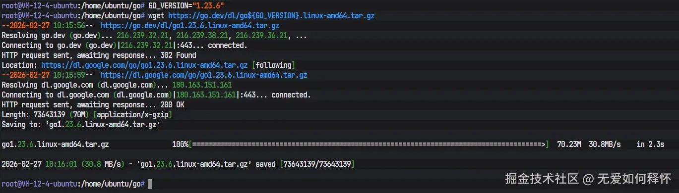 定义环境变量 GO_VERSION 以便于版本管理,利用 wget 直接从 go.dev 获取针对 Linux x86-64 架构的压缩包。
