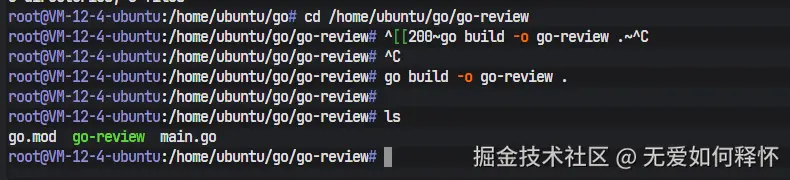 下方截图展示了编译过程。由于 Go 编译器的高效性,该过程通常在数秒内完成。生成的 go-review 二进制文件不依赖外部运行时库,具备极强的移植性。