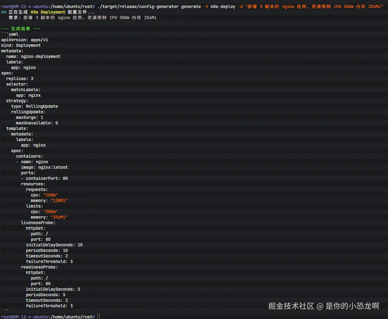 执行命令: ./config-generator generate -t k8s-deploy -d "部署 3 副本的 nginx 应用,资源限制 CPU 500m 内存 256Mi"