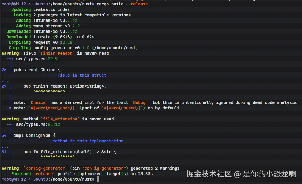 此时,在 target/release/ 目录下生成了名为 config-generator 的可执行文件。该文件是静态链接的(除了 glibc),具备极强的移植性,可以直接拷贝到其他相同架构的 Linux 机器上运行,而无需重新安装 Rust 环境。