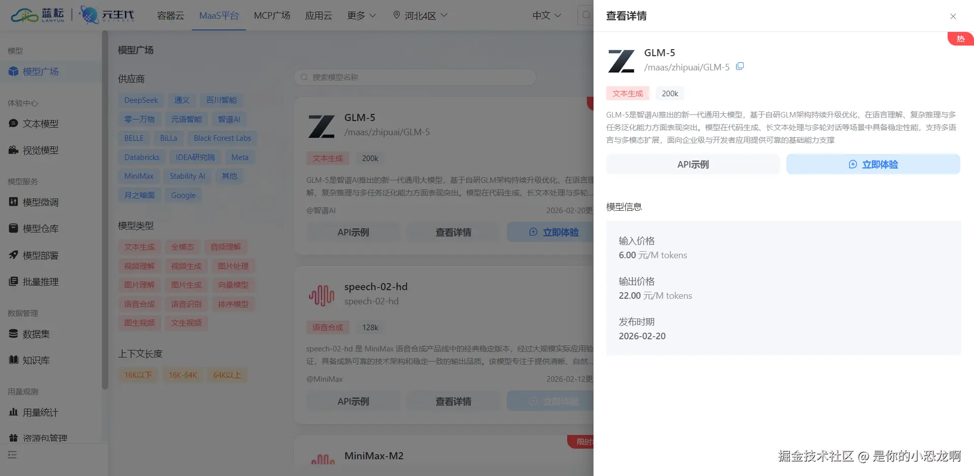 在模型广场中,选择 GLM-5 模型。智谱 AI 开发的 GLM 系列模型在中文理解与代码生成方面表现优异,非常适合用于生成复杂的配置文件。