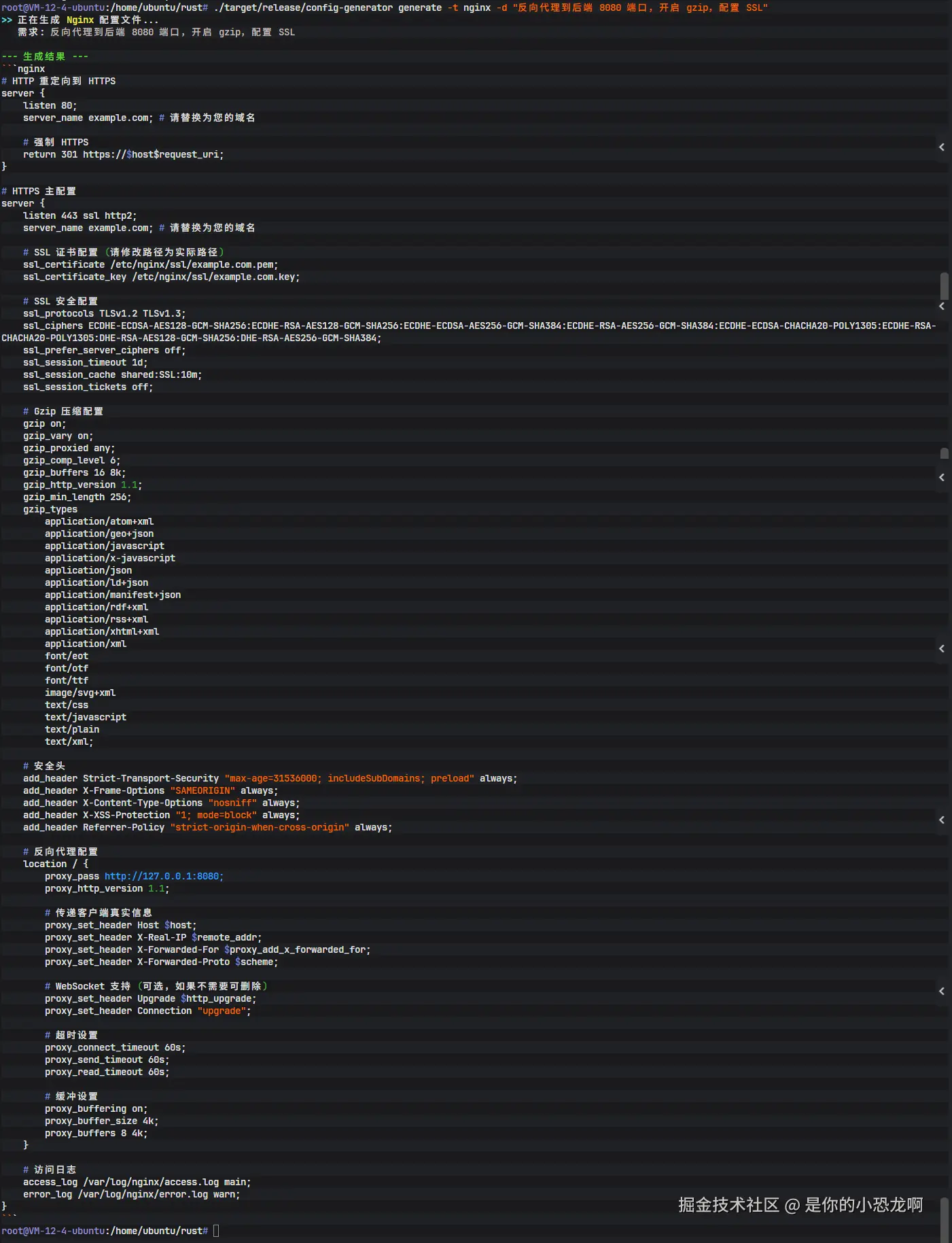 执行命令: ./config-generator generate -t nginx -d "反向代理到后端 8080 端口,开启 gzip,配置 SSL"