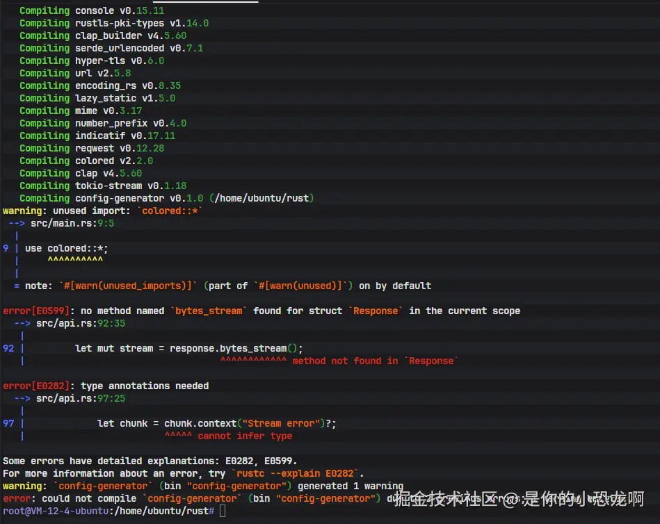 上图显示的错误信息指出 bytes_stream 方法未找到。这是因为 reqwest 库默认并不包含所有功能以减小编译体积。流式响应处理属于可选特性。解决方案是在 Cargo.toml 中为 reqwest 添加 stream 特性标志。Rust 的 Feature 机制允许开发者按需开启库的功能,这是控制二进制体积和编译时间的有效手段。