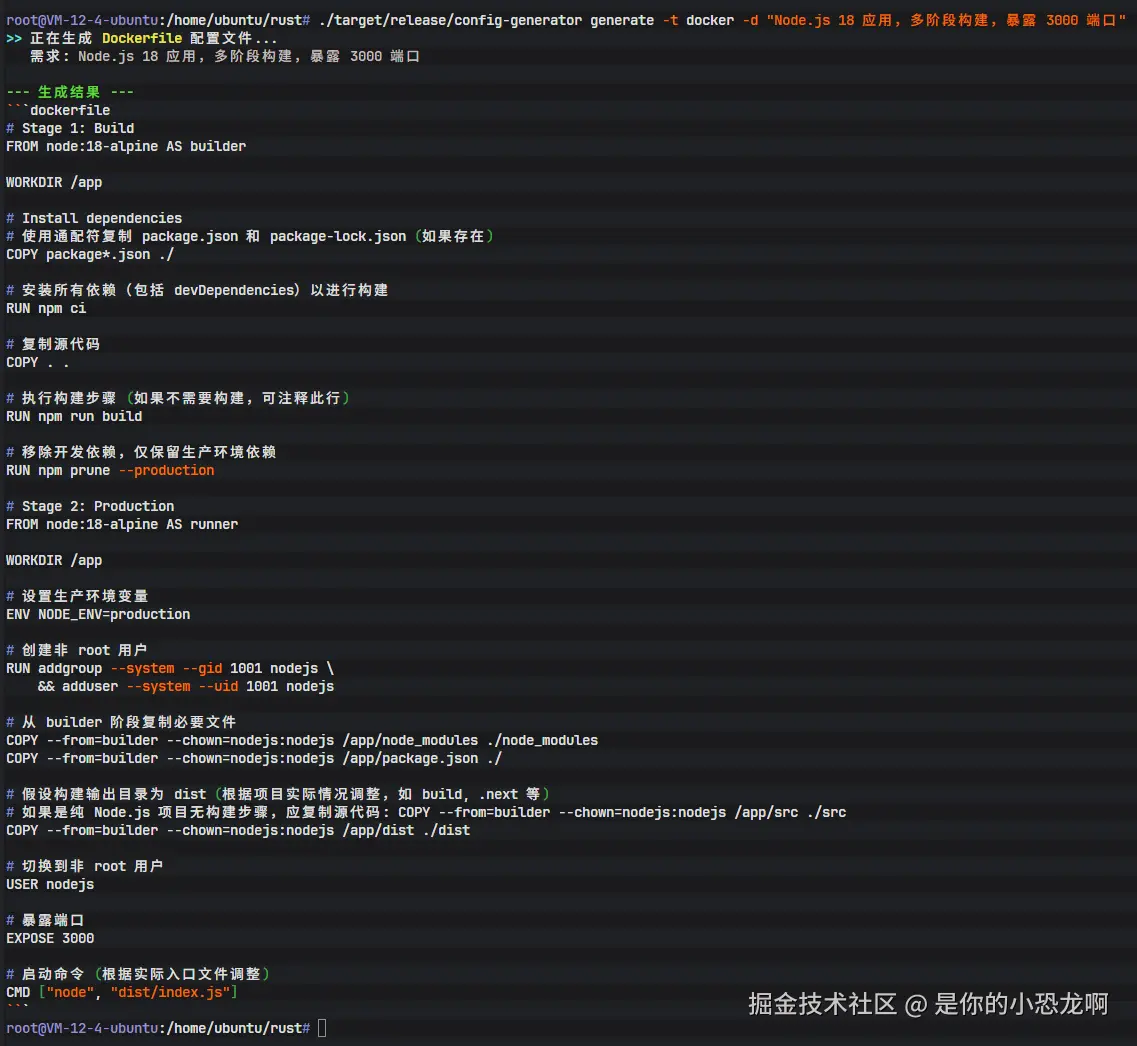 输出结果展示了一个教科书式的多阶段构建 Dockerfile。 第一阶段(builder):使用完整版的 Node.js 镜像进行依赖安装和构建。 第二阶段(production):基于 alpine 轻量级镜像,仅复制构建产物。 这种写法极大地减小了最终镜像的体积,是容器化最佳实践的典型应用。模型能够理解 "多阶段构建" 这一技术术语并正确实现。