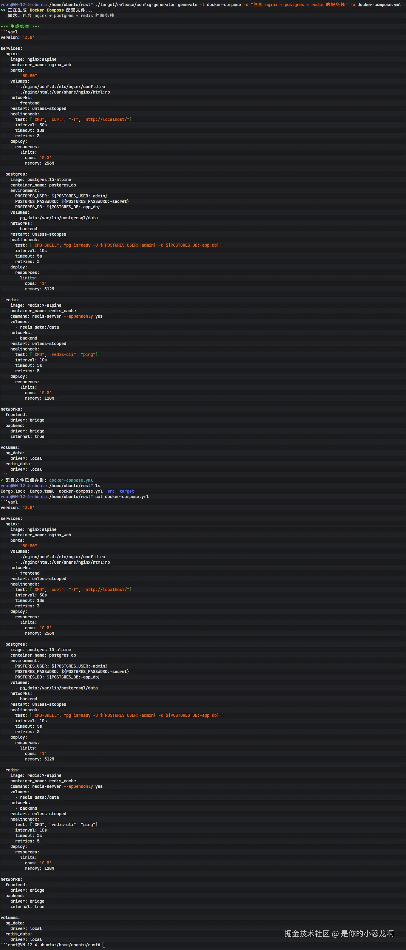 执行命令: ./config-generator generate -t docker-compose -d "包含 nginx + postgres + redis 的服务栈" -o docker-compose.yml