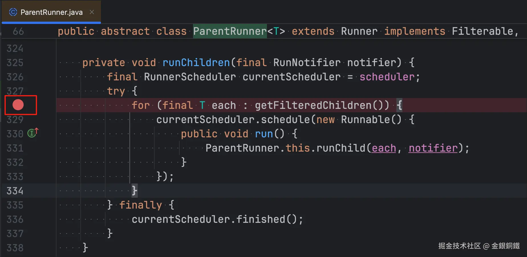 我们在 ParentRunner 类的 runChildren(final RunNotifier notifier) 方法里打一个断点(断点的位置如下图所示)。为了便于描述,我们把这个断点称为 断点甲