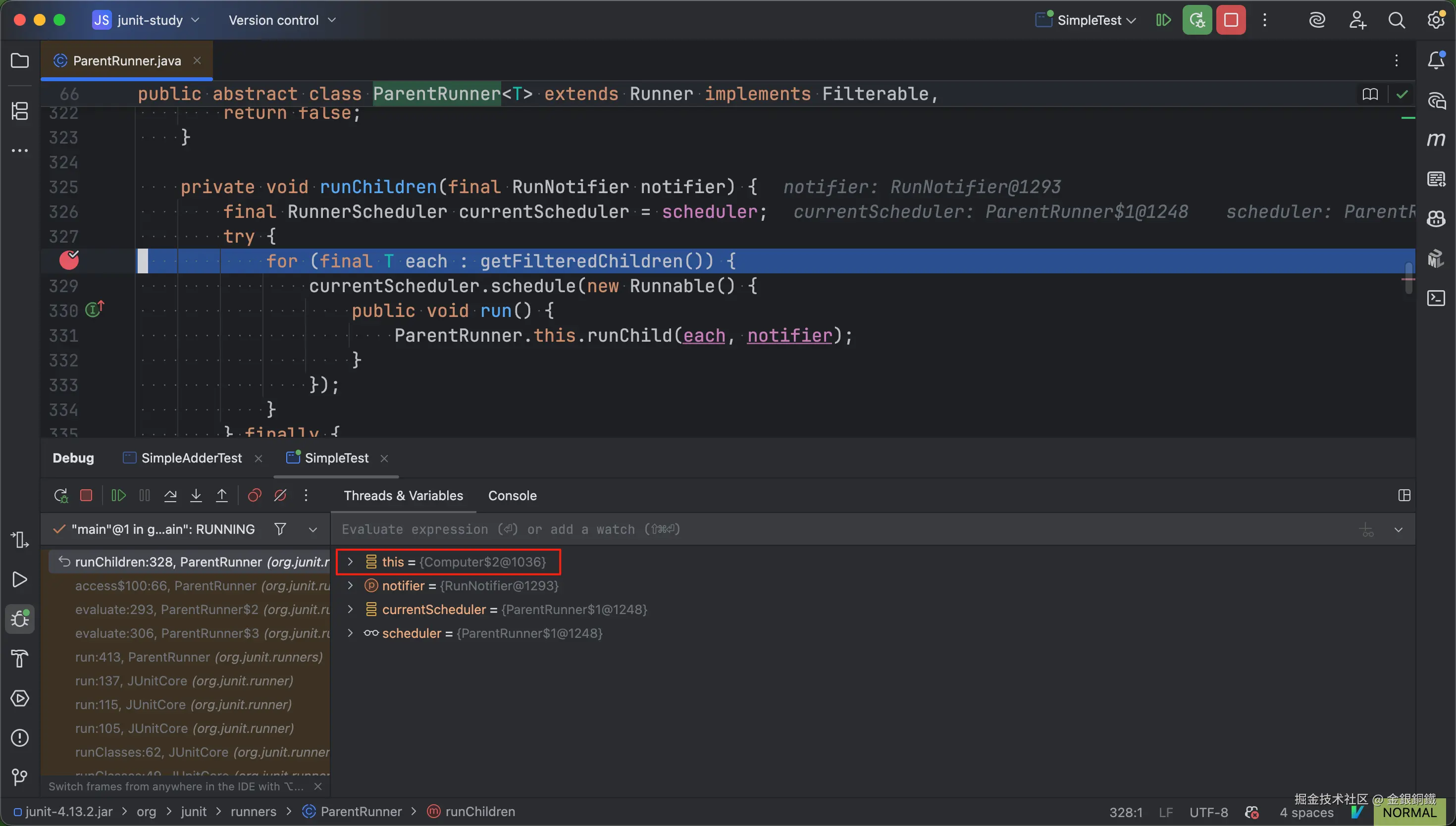 我们在 ParentRunner.java 的第 331 行再新增一个断点(断点的位置如下图所示)。为了便于描述,我们把这个新增的断点称为 断点乙
