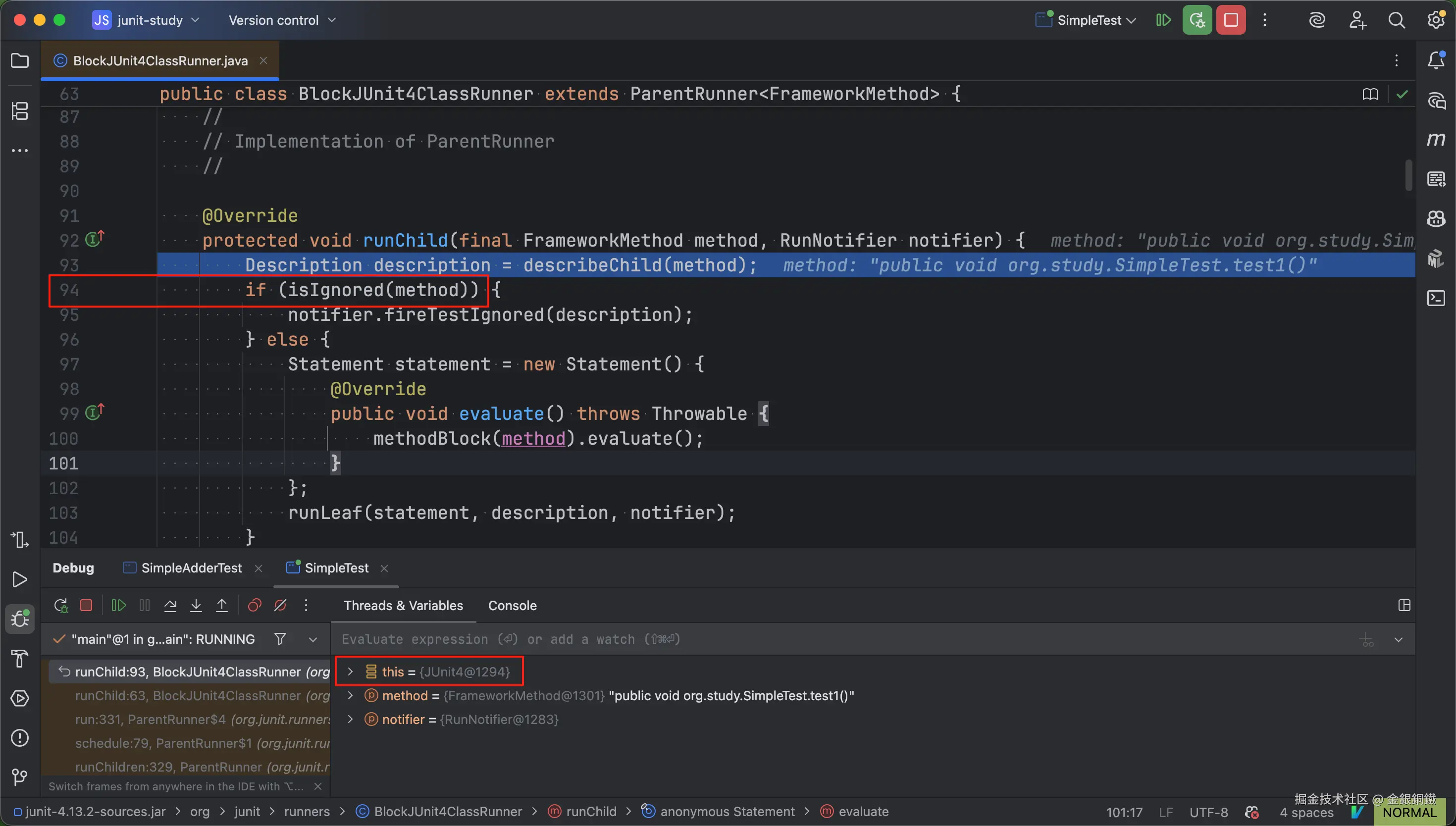 让程序继续运行到 断点乙 这里。然后 Step Into 这个方法,我们会来到 BlockJUnit4ClassRunner 类的 runChild(final FrameworkMethod method, RunNotifier notifier) 方法里。可以观察到 this 的类型是 JUnit4(这个类的全限定类名是 org.junit.runners.JUnit4),而 BlockJUnit4ClassRunner.java 的第 94 行看起来有点可疑 ⬇️