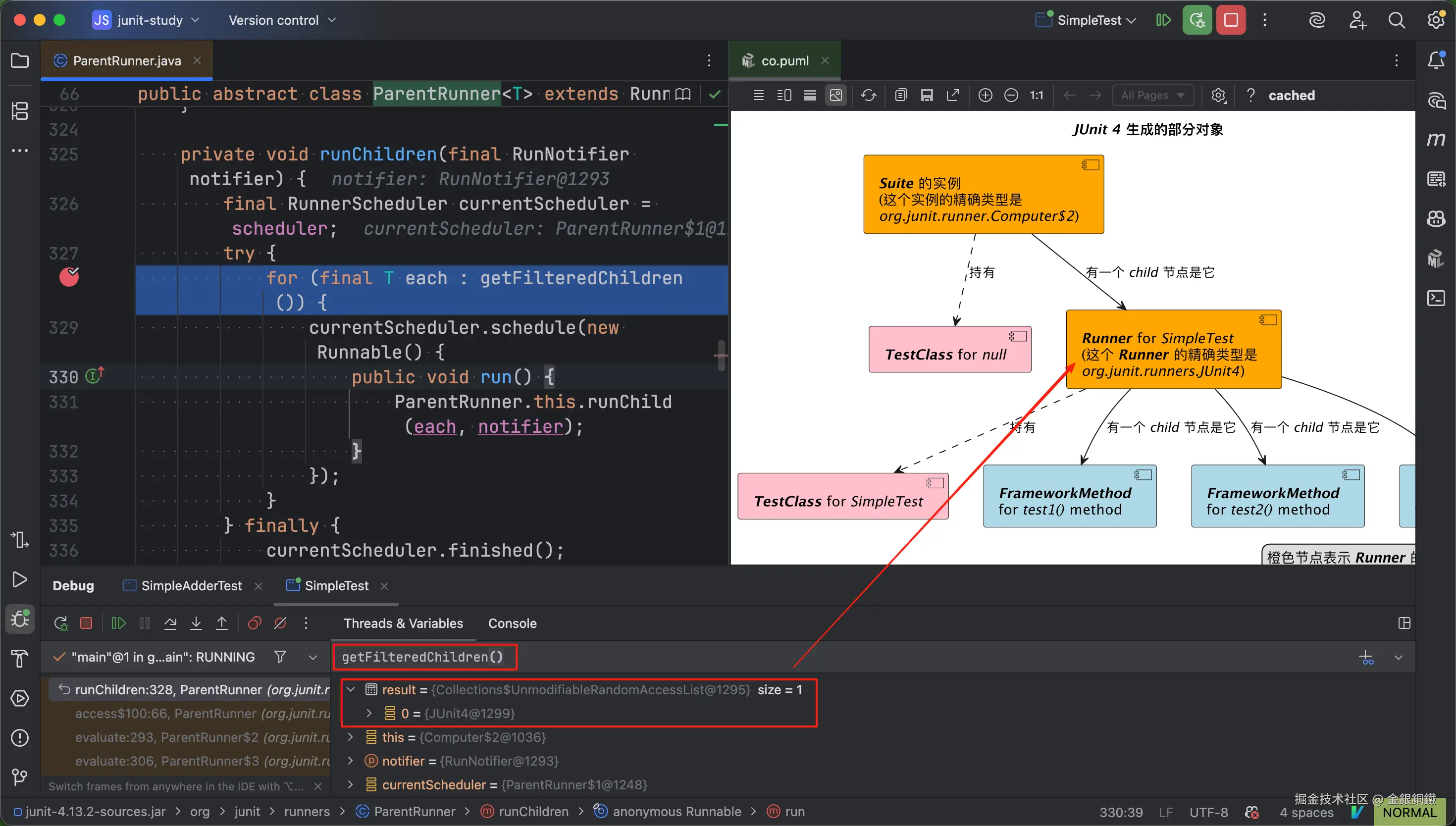 当程序第一次运行到 断点甲 那里时,可以观察到 getFilteredChildren() 方法所返回的 List 中只包含一个元素,而这个元素就是 SimpleTest 对应的 Runner ⬇️