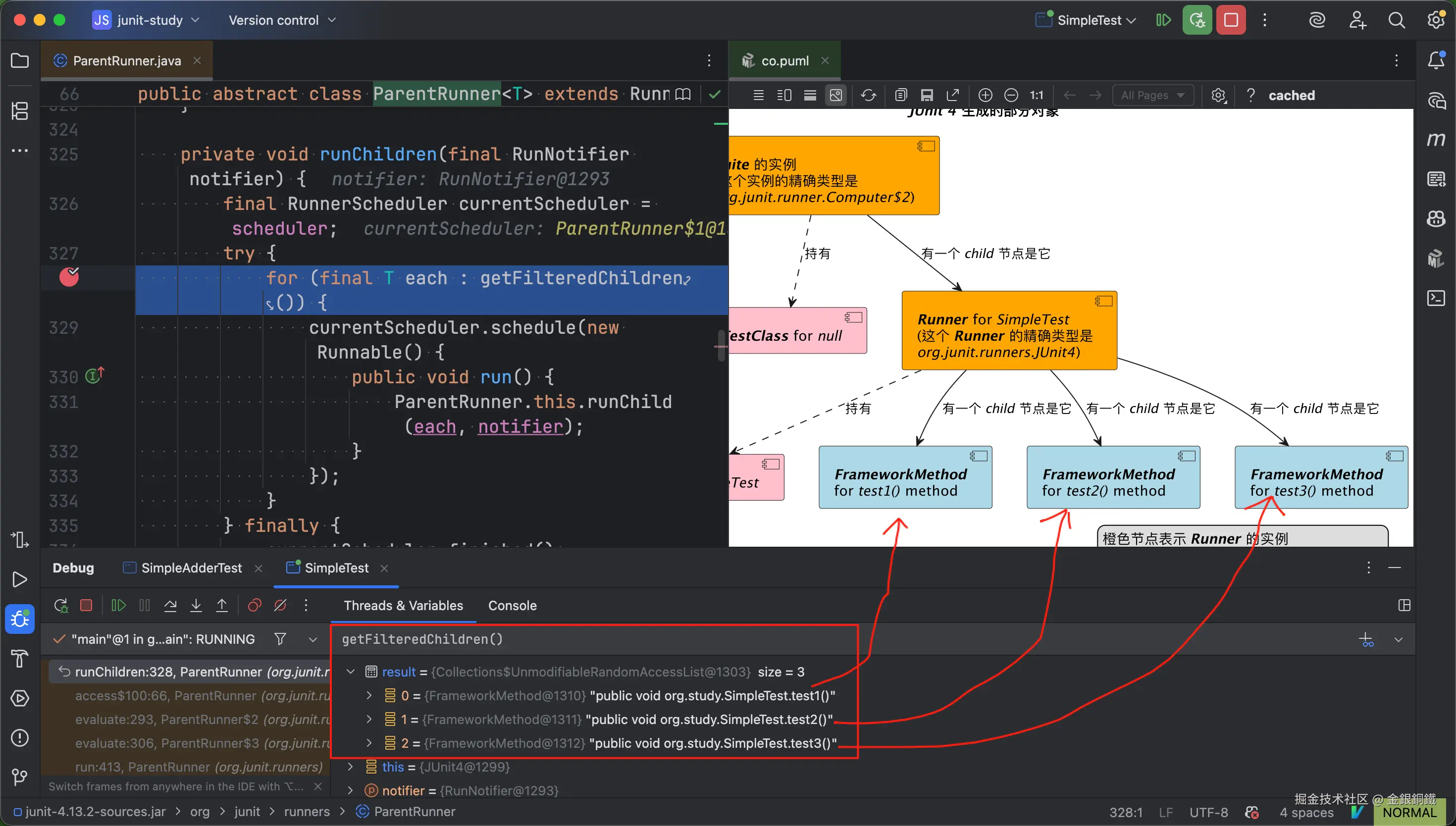 虽然我们只写了 SimpleTest 一个类,但是 JUnit 4 会为我们生成很多相关的对象,其中的一部分对象如下图所示 ⬇️
