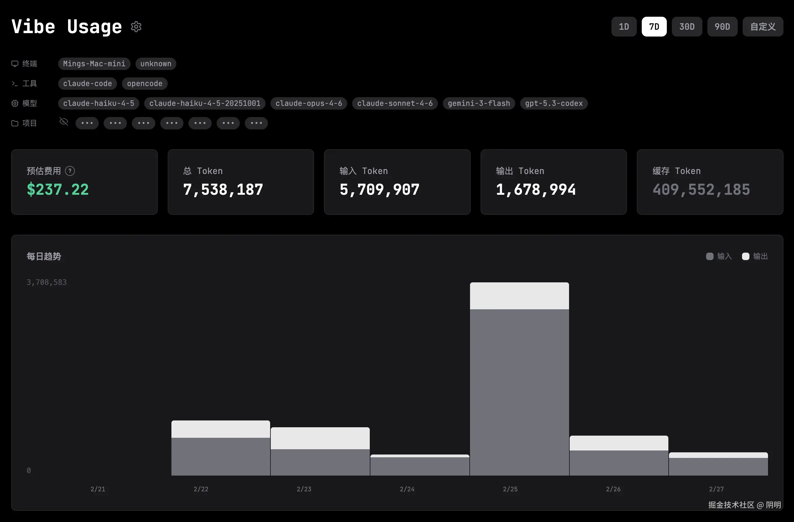 最近在 OpenCode, Claude Code, Codex 等各种工具里切换使用,但是数据(Token 统计)一直做的不好。因此就自己 Vibe 了一个,欢迎大家来使用:Vibe Usage
