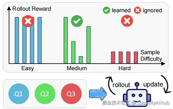 你看,RL训练时,对于容易题和困难题,模型怎么答结果都一样,缺乏改进的"动力"。只有面对那些有对有错的中等题,模型才会感到"困惑",进而产生强烈的"求知欲",从错误中学习,向着正确答案调整。它的注意力,就这么自然而然地被那些"拧巴"的数据给吸引过去了。