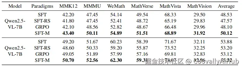 更有趣的是,这个方法的好处不仅体现在普通的视觉任务上。在更复杂的数学推理测试中,"纯净版SFT"同样吊打了标准SFT和RL,拿下了多个测试集的最高分。