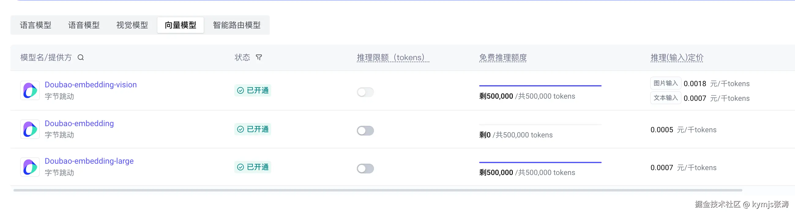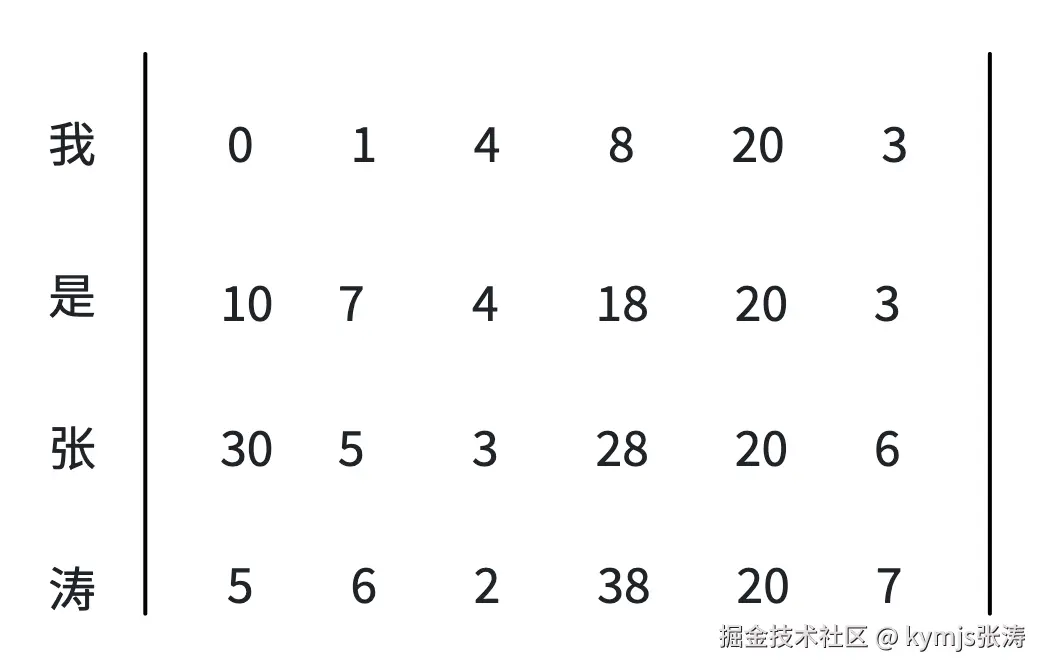 比如字节火山引擎的一系列向量模型,就是做这件事的:如果有一段文本叫"我是张涛",假设这段文本是4个token,每个字是一个token。那么每个token被向量模型转化后,就变成了一个数组,数组表示这个token在坐标系中的位置坐标,数组的长度就是这个向量模型的维度。比如在平面直角坐标系中,我们可以用两个数字确定一个点(x, y),因为平面是二维的。在空间直角坐标系中,需要三个数字确定一个点(x, y, z),因为空间是三维的。假设我们现在的向量模型是6维的,前面我们说的"我是张涛"这四个token,转化成了四个长度为6的数组,也就是一个4行6列的二维数组,也可以用矩阵表示。