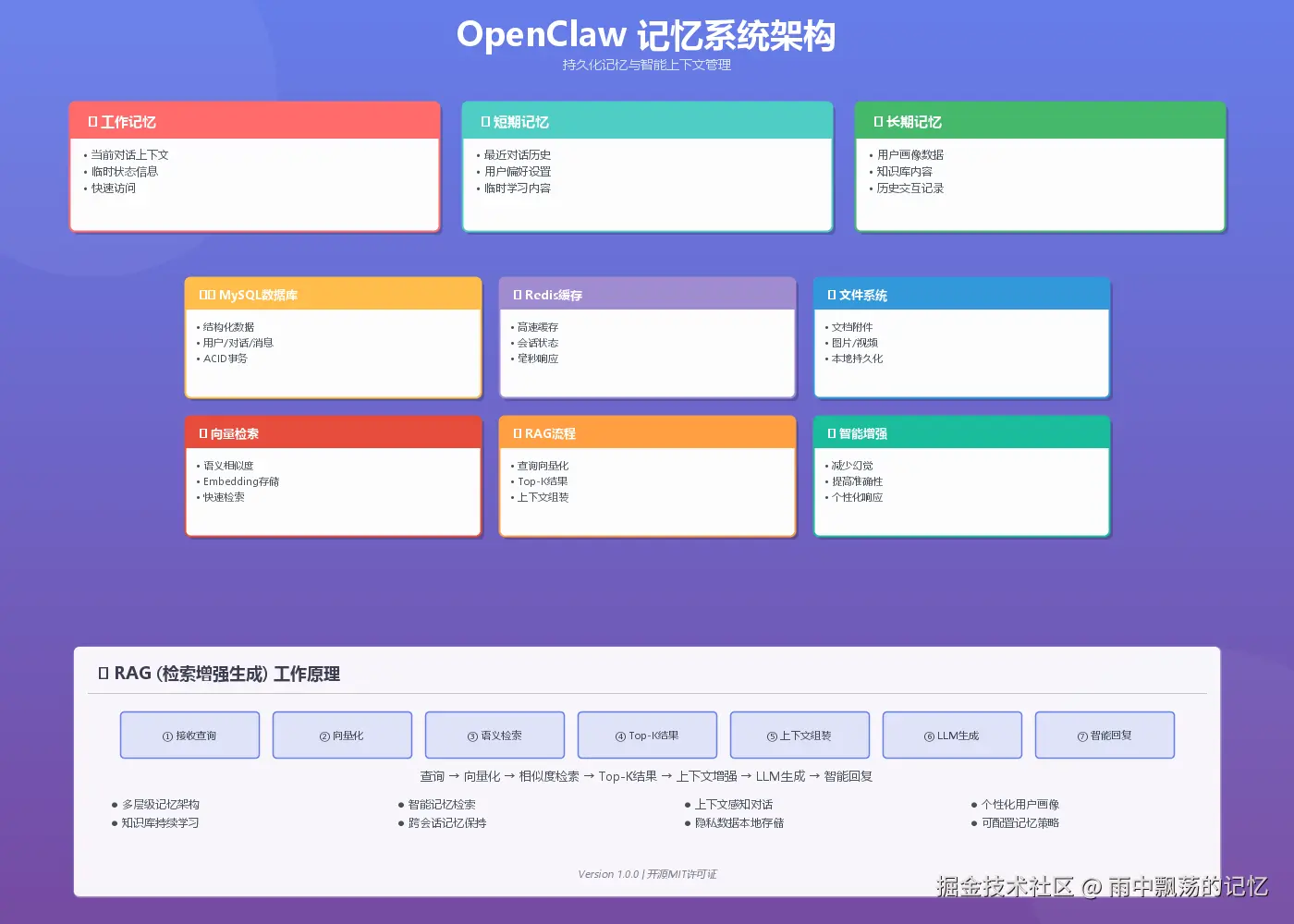 记忆系统是OpenClaw的"灵魂",上图展示了三层记忆架构和完整的RAG(检索增强生成)工作流程,确保AI能够记住重要信息并提供个性化的响应。