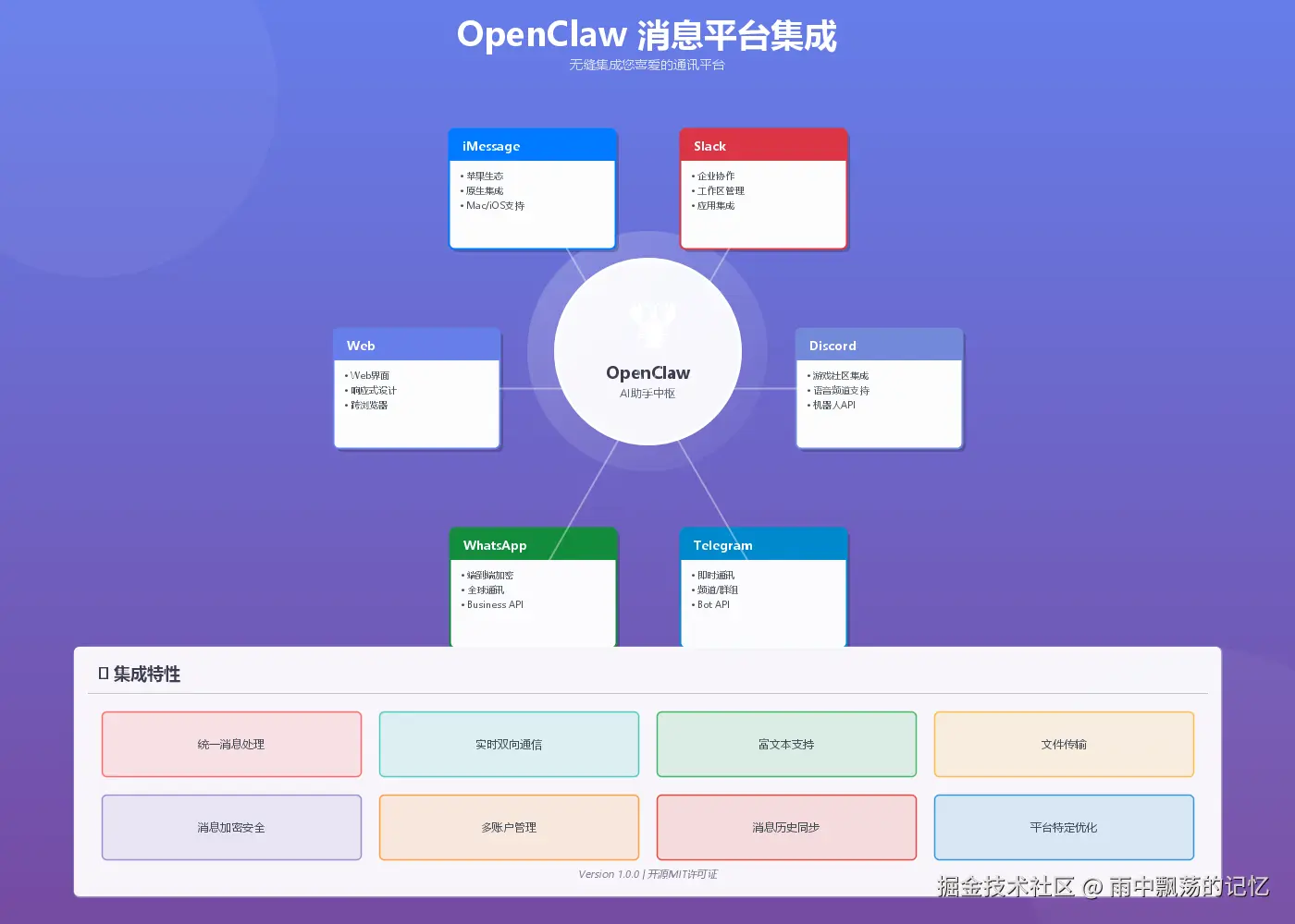 - 多平台集成:支持 Discord、Telegram、WhatsApp、iMessage、Slack 等主流通讯平台
