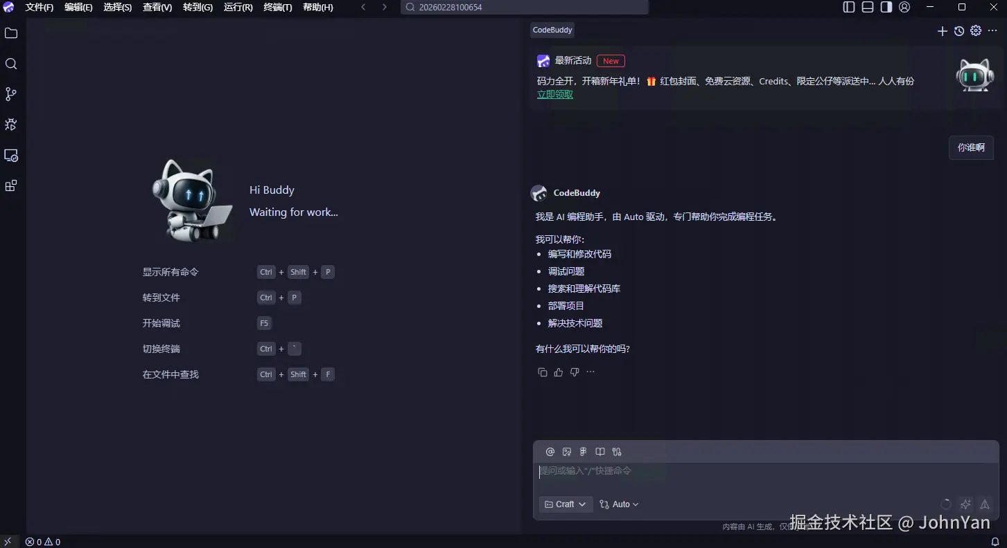CB软件启动运行后,就进入了开发者非常熟悉的VsCode IDE窗口。一般情况下会直接启动一个带有CodeBuddy面板的窗口(右侧),其实在这个时候,就可以开始工作了。和普通的AI Chat软件类似: