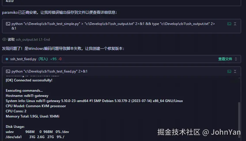 这个过程其实并不顺利,它在处理远程系统的连接过程中,遇到了一些麻烦。因为它需要编写一些python代码来完成这些任务,由于默认执行环境的差异,这些代码无法正常运行(Windows vs Linux)。这对于经验比较丰富的运维人员而言,会经常遇到,解决起来也不是太复杂。但比较神奇的是CB和其后面的模型平台,可以通过这些错误信息,自行分析这些问题并查找处理方案,稍微反复了一下,后来还是解决了。