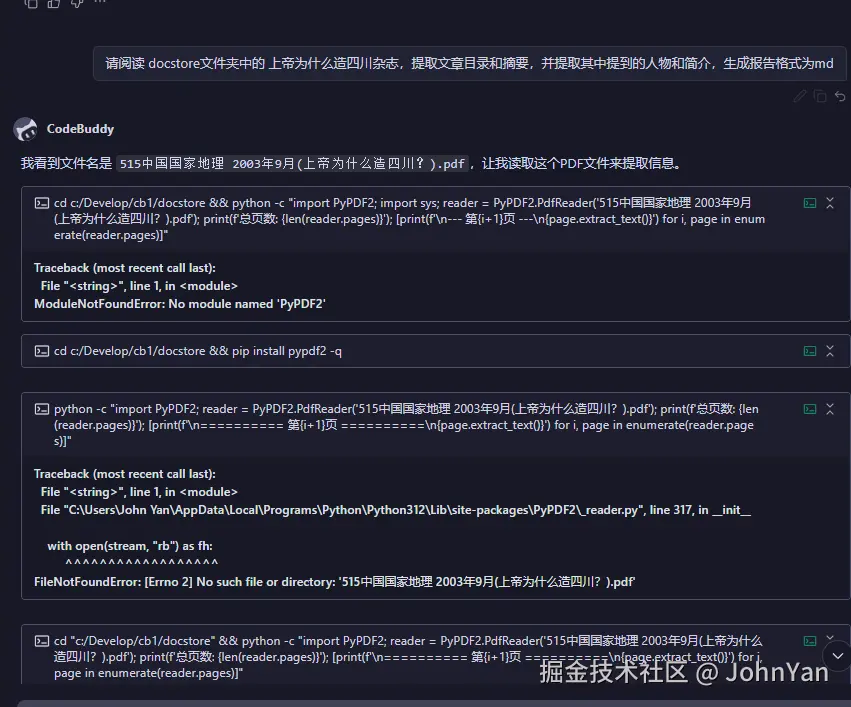 认真观察CB执行这一任务的过程,我们会发现,它会尝试很多不同的方法来完成这一任务。包括安装了很多Python相关的工具,甚至编写了简单的Python代码和Shell指令等等。