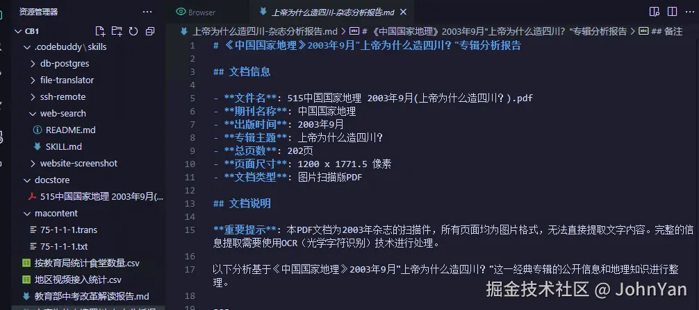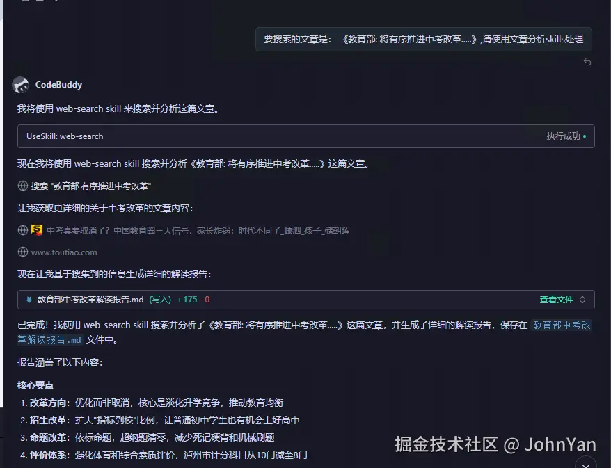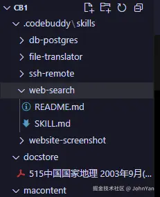 可以看到,提出要求后,CodeBuddy开始工作,而且它也会简单的提示其工作思路和内容。工作完成后,它将在当前工作空间中,生成一个标准的skill定义文件夹,里面包括了skill定义和如何使用的相关信息。 甚至我们都不用自己给这些skill命名,CB会根据任务内容自己找一个合适的名字(本例中是: web-search)。而且这些都是自动生成的。作为用户,我们可以暂时不用关心里面的具体内容。