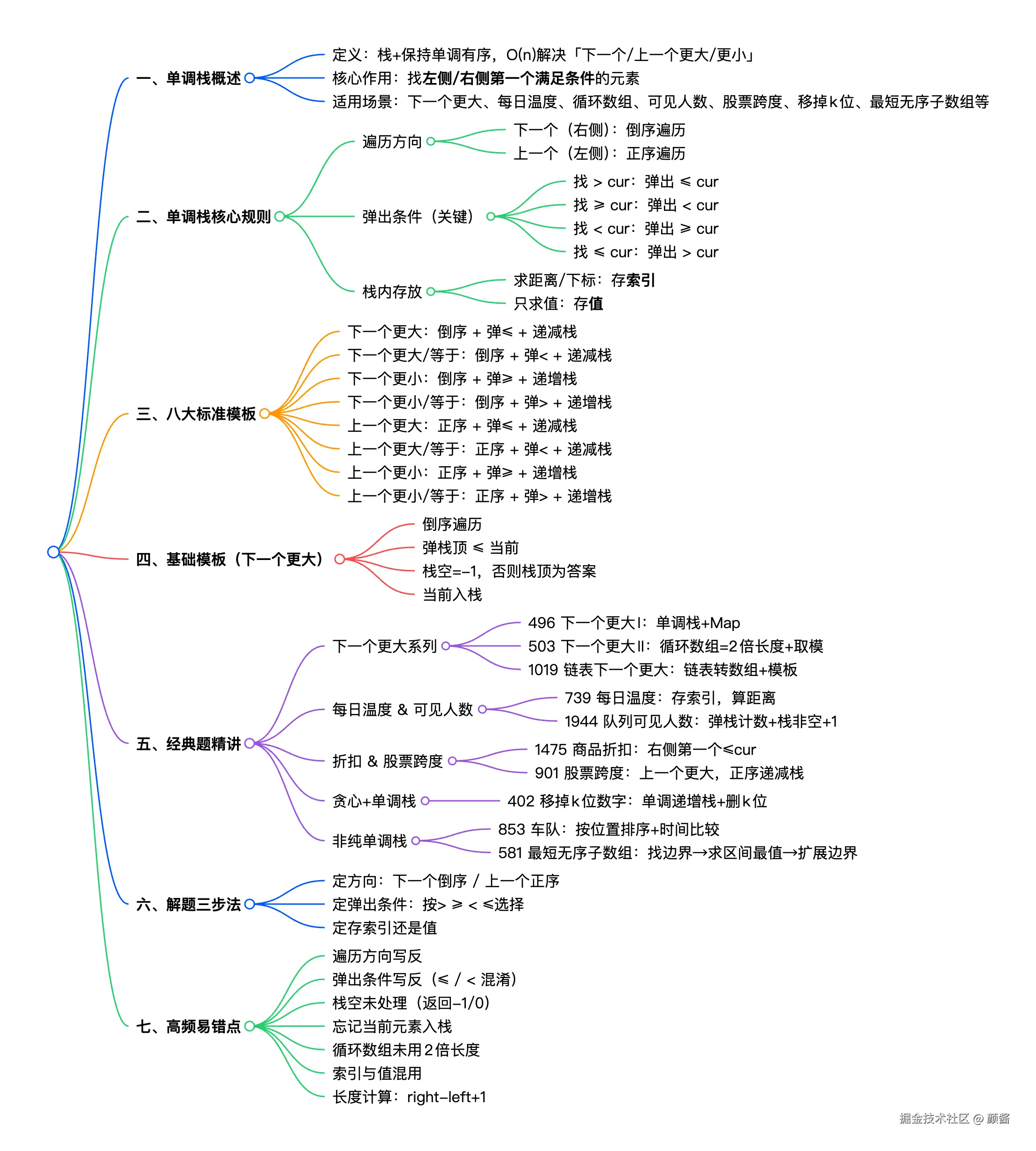 记忆技巧 :找「更大」→ 弹掉 ≤ 当前的(栈顶保留比当前大的);找「更小」→ 弹掉 ≥ 当前的;找「相等可接受」→ 用 < / >,否则用 <= / >=。