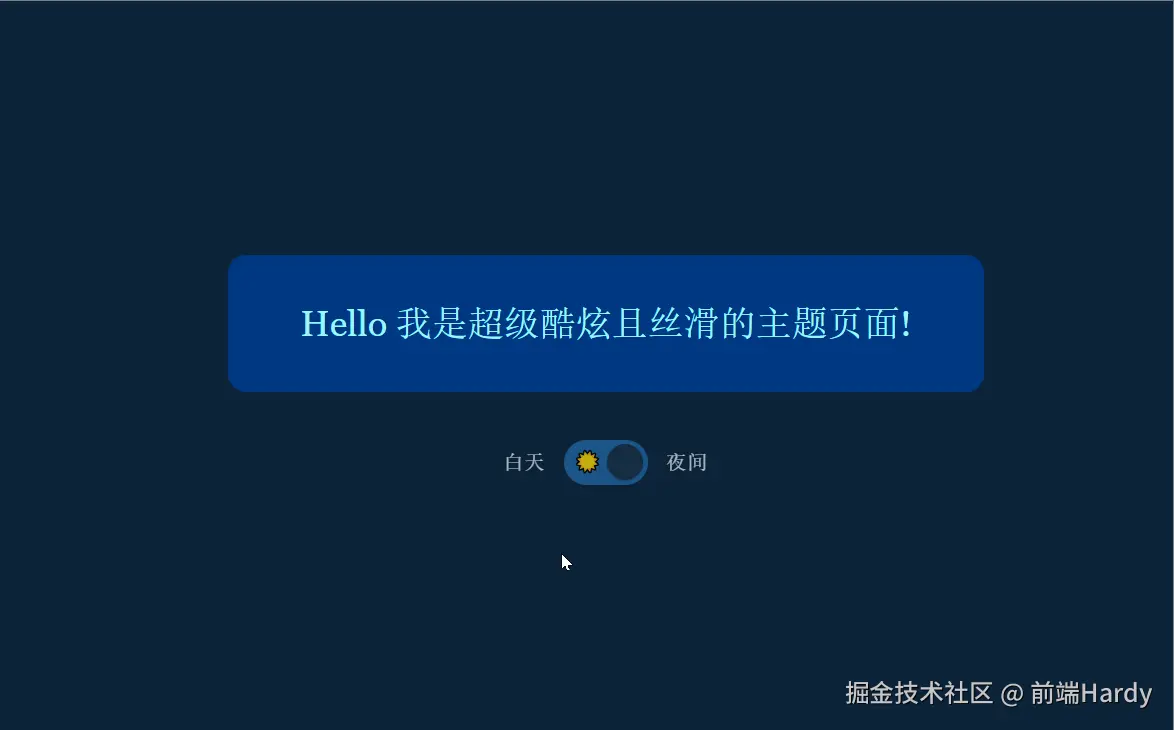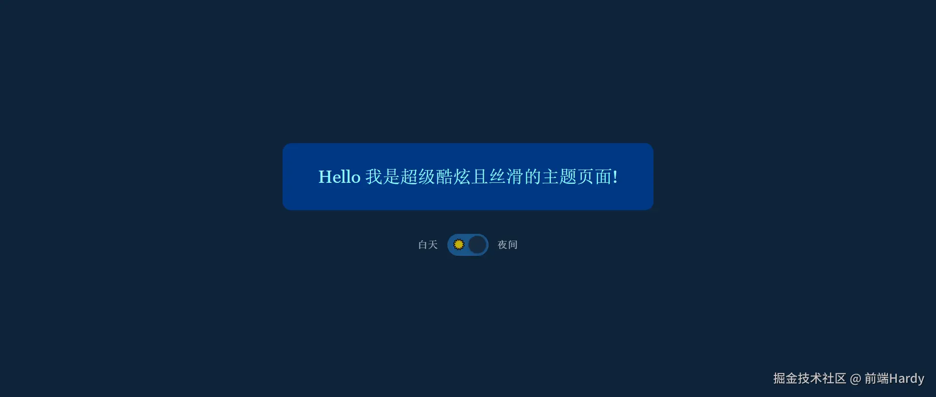 这个 HTML 页面实现了一个现代化、丝滑过渡的白天/夜间主题切换功能,完全基于 CSS 自定义属性(CSS 变量)、light-dark() 函数和少量 JavaScript 实现持久化。