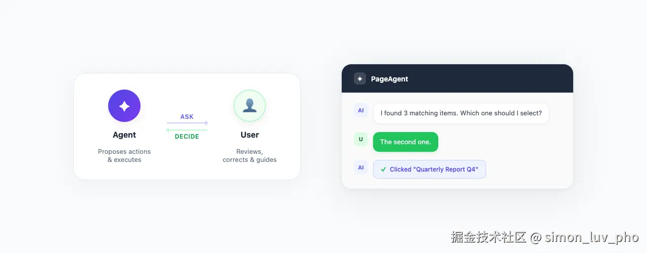 大多数 AI Agent 是 "fire-and-forget" ------ 启动之后你就只能看着它跑,祈祷别出错。Human-in-the-Loop 是任何 AI 工具投入实际生产的必备能力。PageAgent 会展示自己的思考过程,遇到歧义主动询问用户。