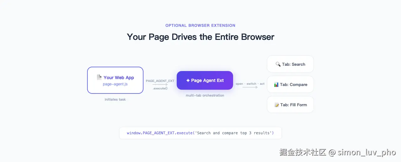是你的网页在驱动浏览器,你网页内的 Agent 可以将 PageAgentExt 作为一个 Tool 来控制用户的整个浏览器(需要用户显式授权)。