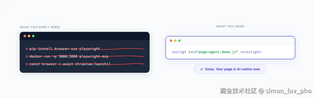 传统方案的部署路径是:安装 Python → 安装 Playwright → 跑一个 Docker → 启动一个无头浏览器 → 截图 → 调 LLM → 解析 → 执行。
